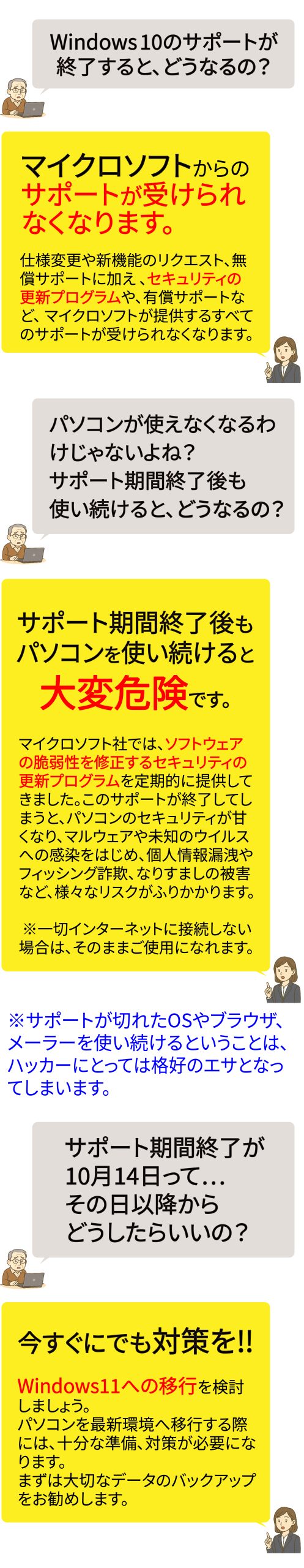 あなたのパソコンは大丈夫? 2025.09.21 確認項目 パソコンの対応状況(スペックなど) メールやアドレス帳の移行(利用しているソフトの対応など) データバックアップ(事前にある程度の整理が必要です) ソフトウェア移行(Win11に対応していない場合があります) 周辺機器の互換性確認(Win11に対応していない場合使用できません)